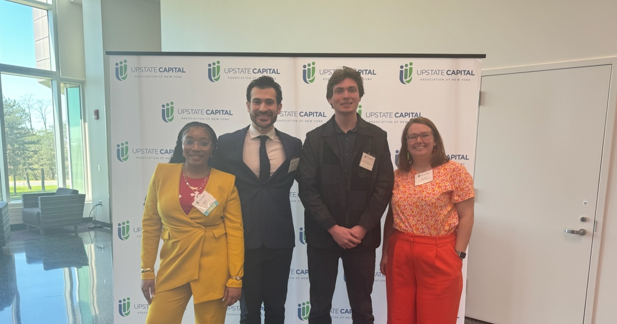 From left: Student entrepreneurs Jada Ivey and Jonah Christakis, student research assistant Jamison Pomroy, and BEP coordinator Olivia Harbol attend NYBPC 2024 in Albany.