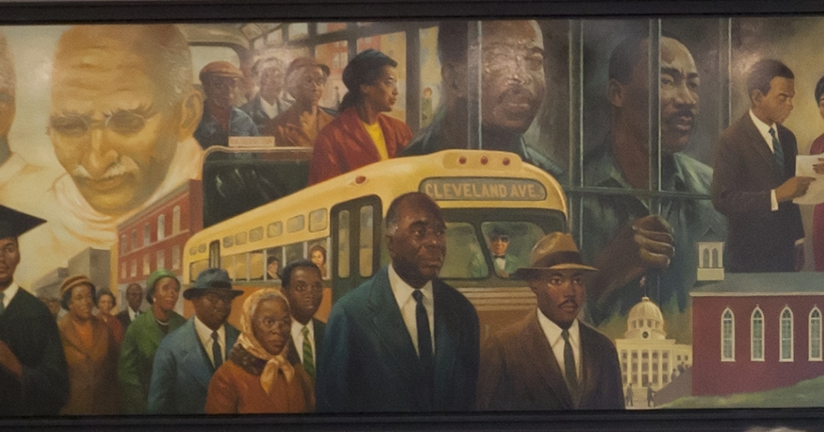 Colorful painted mural depicting notable scenes from Black historical events