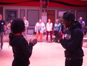 Two students from the RJ Circle face each other smiling