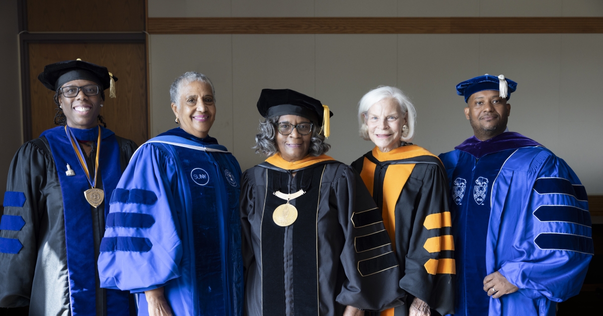 Interim President Bonita R. Durand, Ph.D., offered congratulatory remarks at Academic Convocation, a tradition that recognizes select faculty and staff members with President’s and Chancellor’s Awards for Excellence for their extraordinary efforts on behalf of the university, recognizes significant awards and major grants of faculty and staff members, and welcomes all new employees to campus. Gerard J. Puccio, Ph.D., SUNY distinguished professor of creativity and change leadership, presented the Convocation Address.
