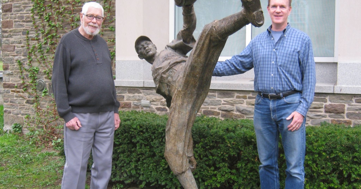 Loren Keller (left) and Jim Keller with the Satchel Paige statue in Cooperstown. Photo provided by Jim Keller.